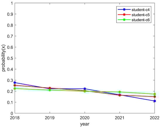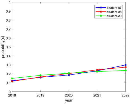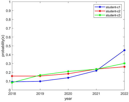 The students’ enthusiasm showed an upward trend and the clubs’ enthusiasm showed a downward trend, as shown in Figure 9 and Figure 10, respectively. This is consistent with the trend of the above model, which converged to (1,0). The reason for this was that students can reasonably allocate their time to participate in activities. However, a club may have to reduce the number of activities it organizes due to funding issues and, thus, would be in a state of passive organization. In such a case, students would still actively participate in order to encourage the club to organize more activities later and thus improve the enthusiasm for the club to organize more activities in the future. As a result, the student motivation would increase while the club motivation would decrease.