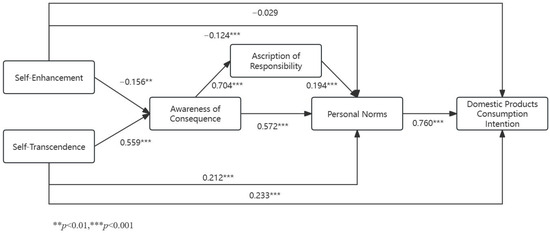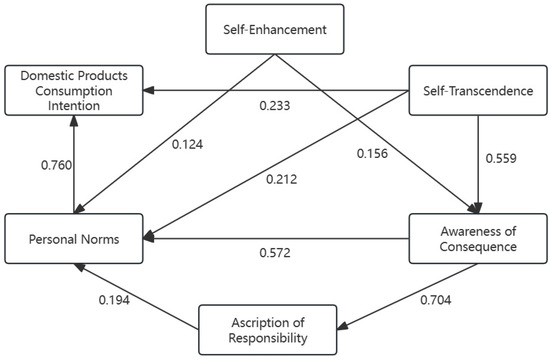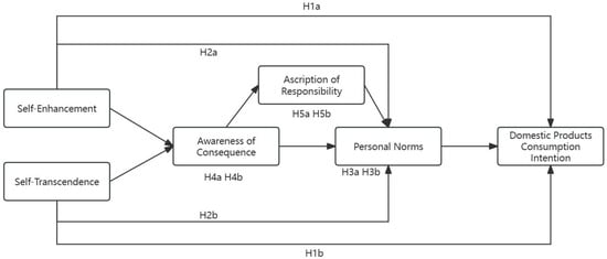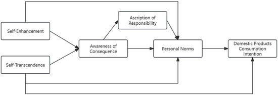 Suppose that personal values are more inclined to engage in pro-social behaviors. In that case, individuals are more likely to attribute negative consequences to themselves when they become aware of the consequences of their non-pro-social behaviors [70,75,76]. For instance, when an individual’s level of “self-transcendence” values is high, characterized by benevolence and universalism, they are more apt to perceive and be affected by the consequences of behaviors detrimental to the collective interest. This heightened perception facilitates the stimulation of their sense of moral responsibility, subsequently increasing the probability of purchasing domestic products. Conversely, a higher level of “self-enhancement” values, which focus more on individual success and personal gain, tends to diminish this perception and the consequent sense of moral responsibility. Based on these insights and the mediation model of NAM, we propose the following hypothesis: