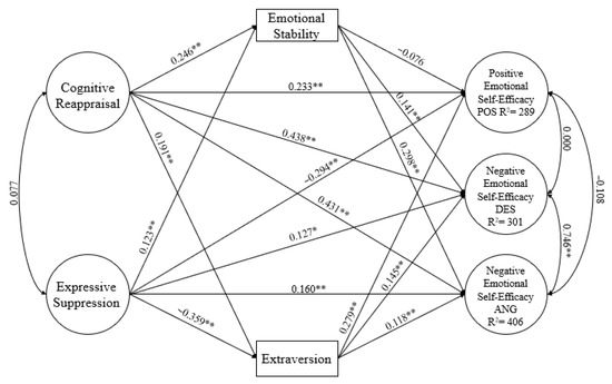 Expressive suppression had direct, positive relationships with self-efficacy for positive and negative (DES and ANG) emotions and with emotional stability. However, it had a negative relationship with extraversion. In this case, the personality trait variables also mediated the relationship between the antecedent and consequent variables, with slightly higher beta values. The model predicted 28.9% of the variance of self-efficacy for positive emotions, 30.1% of the variance for negative emotions of despair and distress (DES), and 40.6% of the variance for negative emotions of anger and irritation (ANG). Associations of greater than 0.25 between variables indicated medium effects. Associations greater than 0.35 indicated large effects [71].