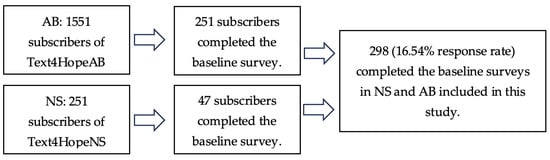 According to the flow chart (Figure 1), between May 14 and June 23, 2023, the total number of subscribers to the Text4Hope program from Alberta is 1551, with 251 providing completed responses at baseline (response rate: 16.18%). From Nova Scotia, 251 subscribers subscribed to the service with 47 respondents providing completed responses at baseline (response rate 18.73%).