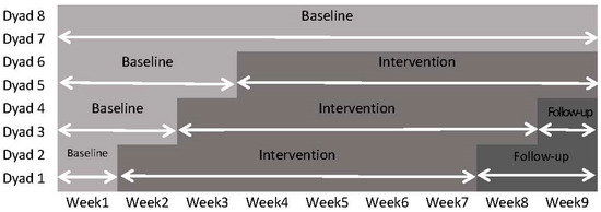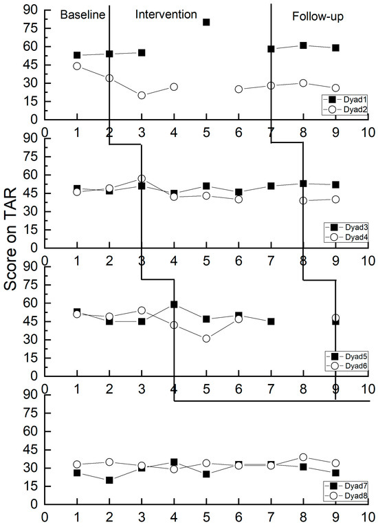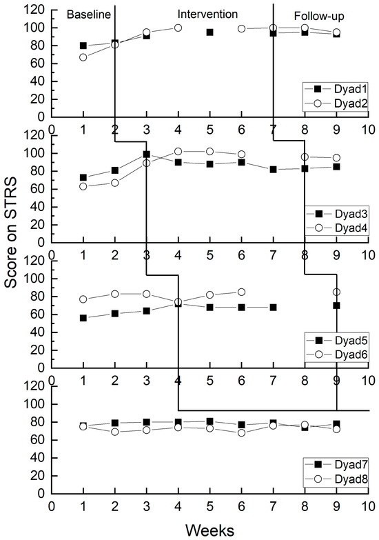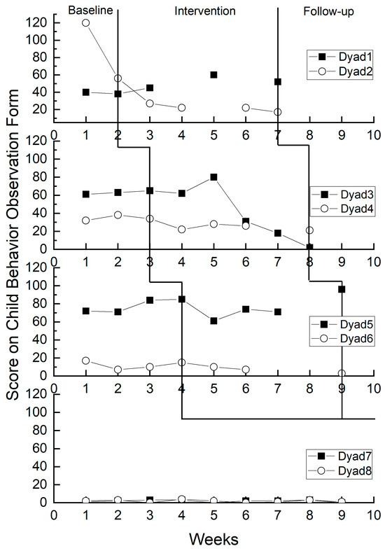 In Figure 2, teachers engaged in the implementation of Banking Time perceived higher quality of child–teacher relationships during the experimental period compared to their baseline perceptions. Teachers who did not participate in Banking Time maintained a stable perception of the child–teacher relationship during the baseline period. Specifically, teachers in Dyads 1, 2, and 4 exhibited a noticeable increase in their perceived child–teacher relationship scores at different stages. Teachers in Dyads 3, 5, and 6 demonstrated a gradual upward trend in their perceived child–teacher relationship scores, while teachers in Dyads 7 and 8 maintained stable scores at different stages.
