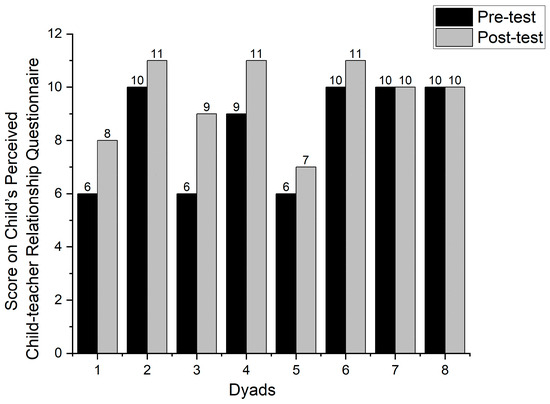 As shown in Figure 3, children who participated in Banking Time sessions perceived higher child–teacher relationships in the post-test compared to the pre-test. Children who did not participate in Banking Time sessions showed no change in their perceived child–teacher relationships between the pre-test and post-test.