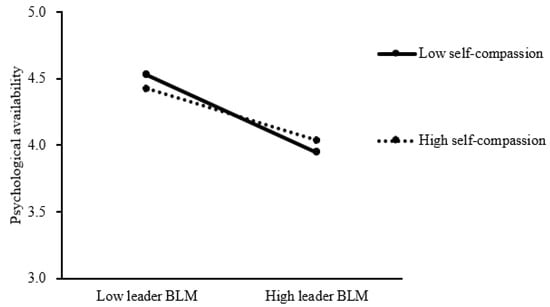 As shown in Model 3, we conducted an interaction term (leader bottom-line mentality × psychological availability) to test the moderating role of self-compassion in the relationship between leader bottom-line mentality and psychological availability. The results indicate that the interaction term has a significant and positive relationship with psychological availability (B = 0.49, SE = 0.25, p < 0.05), which supports the existence of the moderating effect. To clearly demonstrate the direction of the moderating effect, we plotted a moderation effect paradigm (as shown in Figure 2) based on the influence of the independent variable (i.e., leader bottom-line mentality) on the dependent variable (i.e., psychological availability) when the moderating variable (i.e., self-compassion) was grouped into high and low levels. Specifically, the negative relationship between leader bottom-line mentality and psychological availability is weaker (bhigh = −0.20, SEhigh = 0.03, phigh < 0.001; blow = −0.30, SElow = 0.04, plow < 0.001) when self-compassion is high (mean + 1SD) than when self-compassion is low (mean—1SD), indicating that self-compassion can alleviate the negative relationship between leader bottom-line mentality and psychological availability. Therefore, Hypothesis 4 is supported.