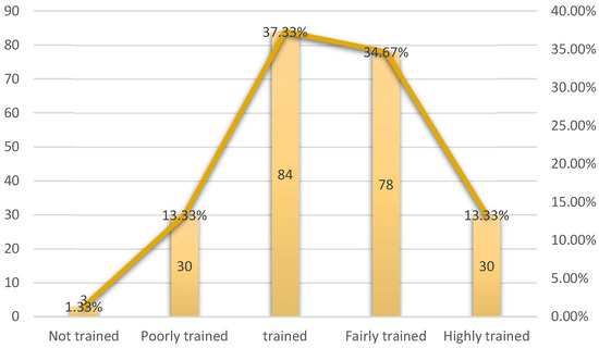 This study shows that the teachers considered themselves to be sufficiently trained with regard to the problem of school coexistence (84/225; 37.33%). Some of the teachers involved in this study (78/225; 78%) said that they were fairly well trained. On the other hand, teachers who claimed to be poorly trained or highly trained were in the minority (30/225; 13.33%, respectively). Only 3 of the 225 teachers taking part in this study (1.33%) said that they were not trained at all (Figure 1).