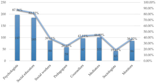 The teachers who considered it necessary to implement the presence of professionals specialised in school problems such as bullying in schools mainly highlighted the figures of psychologists (197/225; 87.56%) and social educators (185/225; 82.2%) (Figure 3).