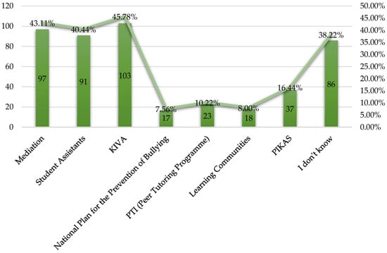 From this study, it appears that many of the teachers were not aware of many bullying prevention programmes. However, it is noteworthy that almost half of the teachers were aware of KIVA (103/225; 45.78%) (Figure 4). Several teachers also referred to the Mediation programme (97/225; 43.11%) and the Pupil Helper programme (91/225; 40.44%). Nevertheless, it is worth noting that a considerable number of teachers (86/225; 38.22%) stated that they were not aware of any bullying prevention programme.