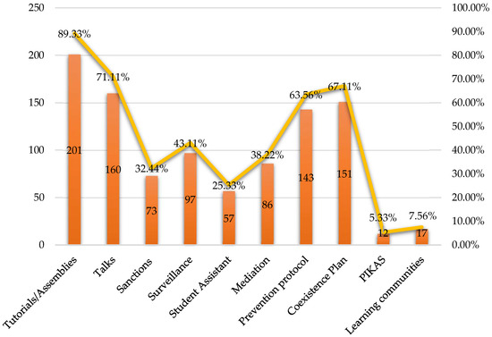 This study shows the preventive measures currently carried out by schools, as well as the preventive measures desired by the teachers themselves. In this sense, teachers indicated that they mainly carried out tutorials/assemblies (201/225; 89.33%) and talks (160/225; 71.11%) developed by teaching staff from the centre or from outside. To a lesser extent, they referred to what is stipulated in the Coexistence Plan (151/225; 67.11%) and the prevention protocol (143/225; 63.56%). Other measures included monitoring (97/225; 43.11%), mediation (86/225; 38.22%), sanctions (73/225; 32.44%), the Pupil Helper programme (57/225; 25.33%), learning communities (17/225; 7.56%), and the PIKAS programme (12/5.33%) (Figure 5).