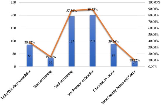 Having indicated the preventive actions carried out in their current schools, the teachers indicated their desired measures to prevent bullying. In this sense, teachers mainly believed it was necessary to involve families (201/225; 89.33%) and to train pupils (197/225; 87.56%) (Figure 6). To a lesser extent, they believed that a subject on education about values (89/225; 39.56%), talks/tutorials/assemblies (86/225; 38.22%), as well as teacher training (35/225; 15.56%) and the collaboration of the FCSE (State Security Forces and Corps) were of interest.