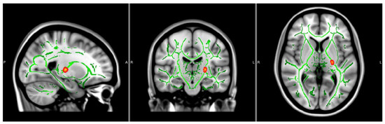 - Smith, S.M.; Jenkinson, M.; Johansen-Berg, H.; Rueckert, D.; Nichols, T.E.; Mackay, C.E.; Watkins, K.E.; Ciccarelli, O.; Cader, M.Z.; Matthews, P.M.; et al. Tract-Based Spatial Statistics: Voxelwise Analysis of Multi-Subject Diffusion Data. NeuroImage 2006, 31, 1487–1505. [Google Scholar] [CrossRef]