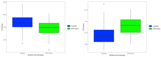 The differences between NTP use and no use in white matter integrity within the left regions of the internal capsule have previously been noted; however, the directionality of these FA values are a departure from some findings in the literature which suggest that adolescent NTP use (mean ages 16–18) may have higher FA values compared to no NTP use [22,48,49,50]. Yet, one study has also observed lower FA values in a similar age range of young adults (mean age 21) who use NTPs [23], suggesting that our result may be uniquely related to later adolescence/young adulthood given the slightly older age of our sample (mean age 19). Our findings are also similar to research demonstrating lower FA values in adult NTP use compared to non-NTP use [11]. It is possible that the relationship between FA and NTP use varies by age and use patterns [24], perhaps contributing to mixed findings in the late adolescence and early adulthood literature. Indeed, previous studies compared individuals who used NTPs against no NTP use [48,50], while our study made comparisons between regular NTP use and NTP controls that included light to no NTP use. Nevertheless, individuals who used NTPs demonstrated lower FA values within our sample, and decreasing FA values have been linked to poor brain and behavioral outcomes across medical conditions in the developmental literature [51]. This is particularly noteworthy as FA values have been shown to increase as individuals undergo healthy neurodevelopment [13]. NTP use may continue to interrupt white matter in these areas, resulting in altered tissue integrity and increased vulnerability to addiction and pathology. Targeted and longitudinal work is needed to help decipher the exact age during neurodevelopment at which NTP use results in a high risk of white matter integrity disruption, as well as the functional outcomes related to that disruption.