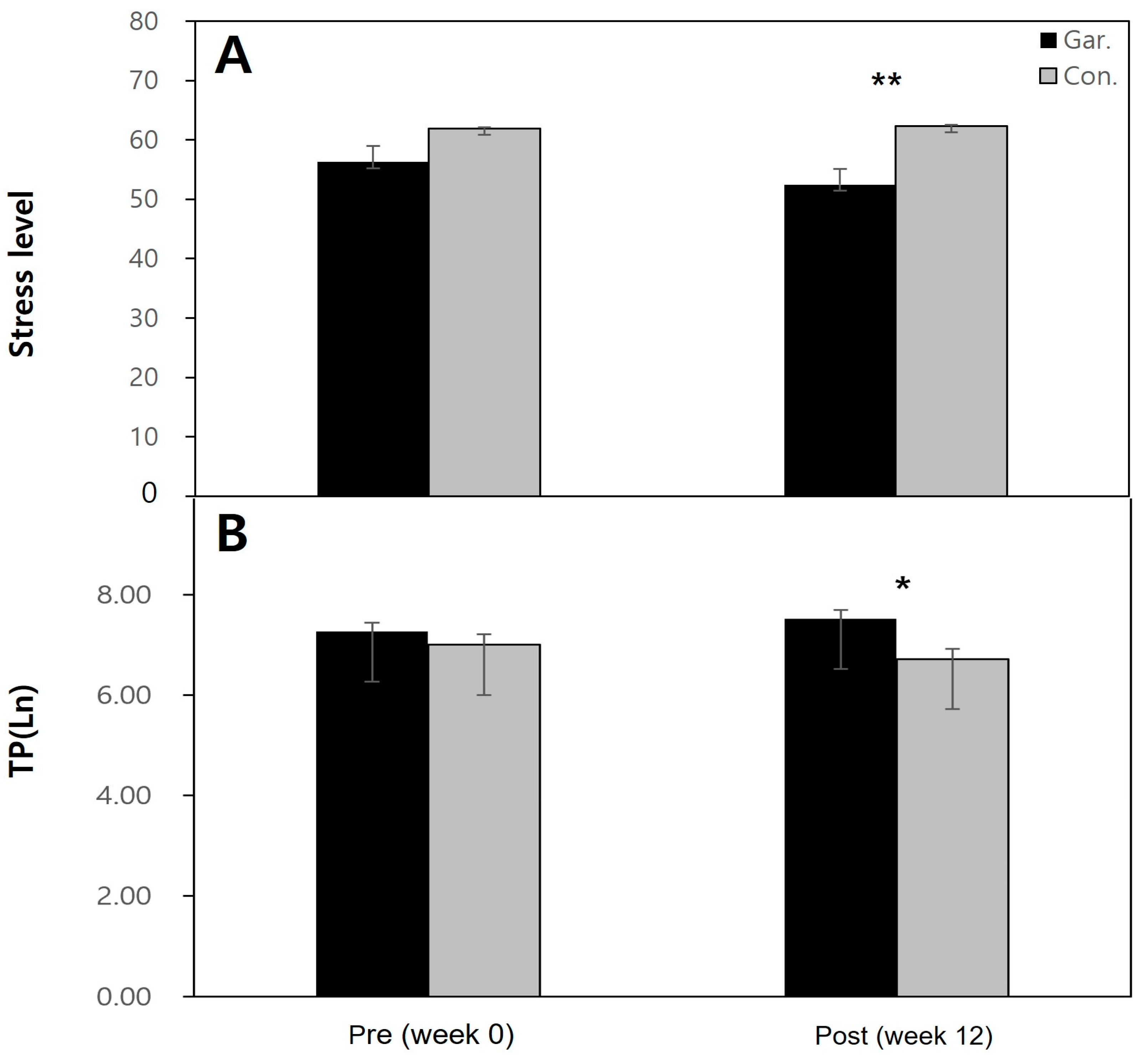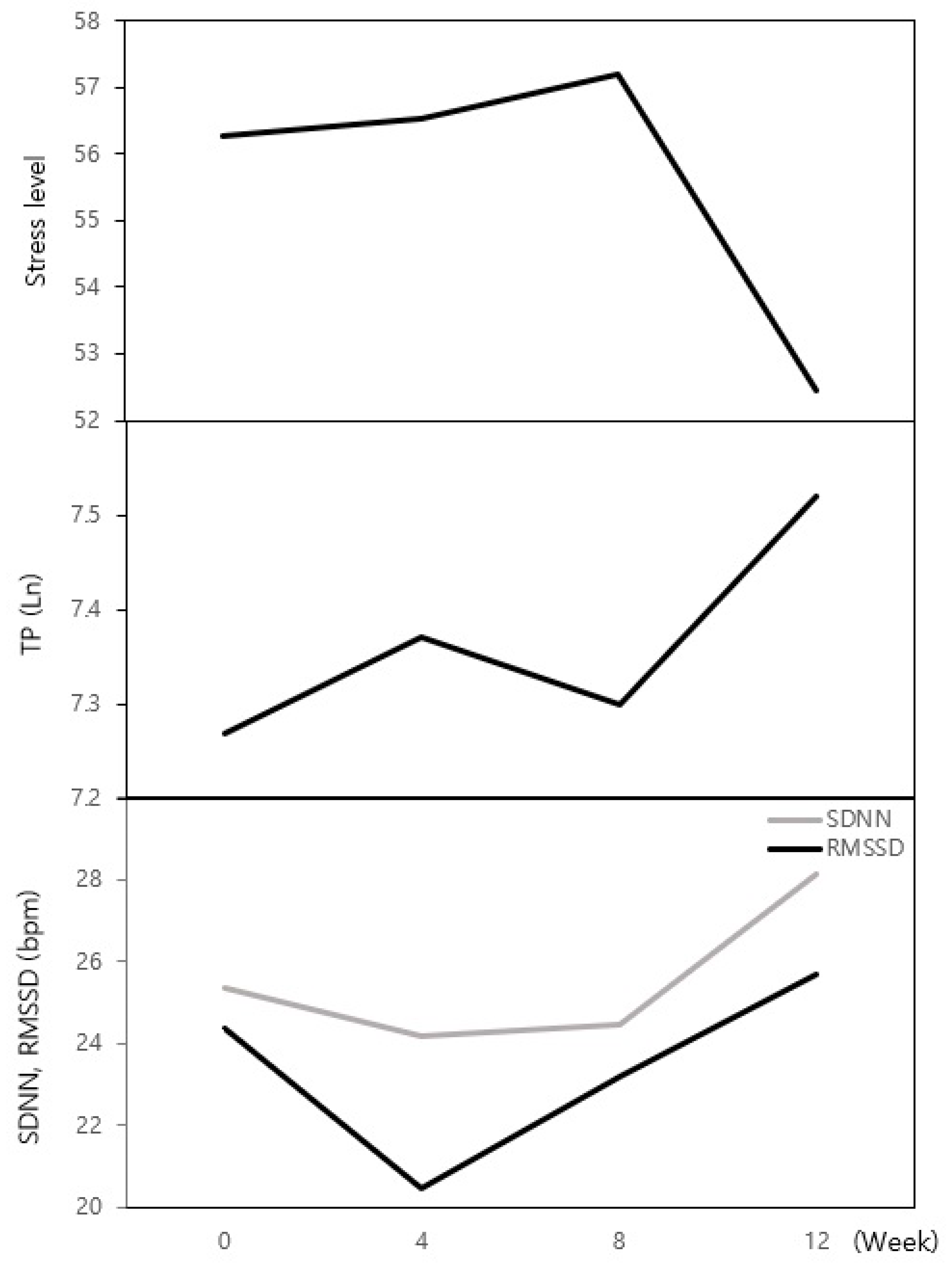 3.2. Changes in Stress and TP, SDNN, and RMSSD of the Gardening Group