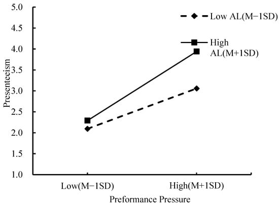 The results (shown in Table 4) indicated that the interaction between performance pressure and authoritarian leadership had a significant positive impact on presenteeism (β = 0.114, p < 0.05, Model 4) and was consistent with the regression effect of performance pressure on presenteeism (β = 0.504, p < 0.001, Model 4). Thus, the results provided initial support for H2. Additionally, this study used PROCESS macro to test H2, and adopted [71] procedures to plot the interaction effect. As shown in Table 5 and Figure 2, under low authoritarian leadership conditions (Mean − 1 SD), the effect of performance pressure on employee presenteeism was significant (Effect = 0.385, p < 0.001). Under high authoritarian leadership conditions (Mean + 1 SD), this relationship remained significant and was significantly enhanced (Effect = 0.660, p < 0.001). Therefore, H2 was supported.