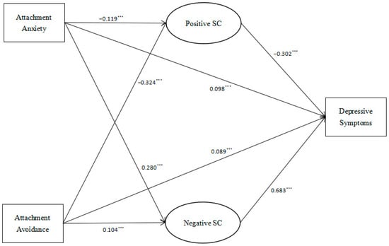 In the overall model, attachment anxiety (β = −0.119, p < 0.001) and avoidance (β = −0.324, p < 0.001) negatively predicted positive self-compassion, which then negatively predicted depressive symptoms in young adults (β = −0.302, p < 0.001). Additionally, attachment anxiety (β = 0.280, p < 0.001) and avoidance (β = 0.104, p < 0.001) positively predicted negative self-compassion, which then positively predicted depressive symptoms in young adults (β = 0.683, p < 0.001). Furthermore, attachment anxiety and avoidance positively predicted depressive symptoms (β = 0.098, p < 0.001; β = 0.089, p < 0.001).