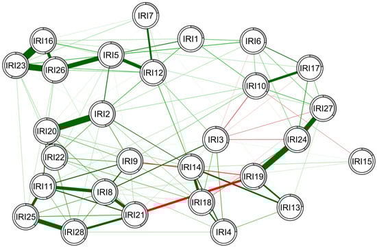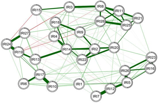 Estimated network structure of IRI items in the low schizotypy group. Edges in green indicate positive partial correlations, while the red lines indicate negative ones. The thicker the line, the stronger the connection. The white ring around the nodes shows the amount of variance that the item covers. IRI: Interpersonal Reactivity Index.