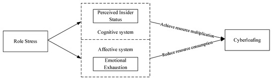 Additionally, the conservation of resources theory (COR) will be employed to analyze how cognitive and affective systems, influenced by role stress, contribute to cyberloafing. COR proposes that people always strive to maintain and protect existing resources, acquire and cultivate new resources, and adopt different coping strategies to maintain and accumulate resources [24]. In the cognitive system, employees perceive the insider status as a valuable resource invested in role behaviors to add value to help. This perception inspires employees to develop a stronger emotional connection with the organization, and they may be able to focus more on their work tasks instead of wasting time on irrelevant networking activities. In the affective system, employees will engage in cyberloafing behaviors to alleviate fatigue and reduce resource depletion in the face of emotional deficit, as a lack of resources motivates individuals to protect their valuable resources and reduce the potential loss of resources.
