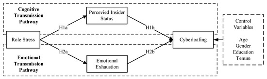 This investigation delves into the pervasive yet insufficiently examined phenomenon of “cyberloafing”, characterized by employees engaging in non-work-related internet activities during office hours. Despite its frequent occurrence in contemporary work environments, the fundamental mechanisms underpinning cyberloafing remain largely uncharted. This study uses the conservation of resources theory and the cognitive–affective personality system framework to demystify the relationship between role stress and cyberloafing. We developed a dual-path model to assess the mediating roles of perceived insider status and emotional exhaustion. Employing SPSS and Smart PLS for data analysis, our research sampled 210 corporate employees. The findings reveal that role stress predicts perceived insider status and emotional exhaustion significantly. Notably, while perceived insider status negatively correlates with cyberloafing, emotional exhaustion shows a positive correlation. These factors mediate the relationship between role stress and cyberloafing, underscoring a multifaceted dynamic. Our results provide new theoretical insights into the mechanisms of employee counterproductive behavior, specifically in the context of cyberloafing, and broaden our understanding of its determinants. This study illuminates theoretical nuances and offers practical implications for managerial strategies and future scholarly inquiries into organizational behavior.