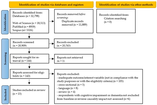 The electronic database search identified 32,798 published articles, of which 11,889 were duplicated and dropped. No relevant articles were found in the reference lists of the included studies. The remaining 20,909 titles and abstracts were screened, resulting in 143 being selected for full-text analysis. A total of 15 observational studies met the eligibility criteria and were incorporated into this systematic review [18,20,21,22,23,24,25,32,33,34,42,43,44,45,46] (Figure 1). Among these, six studies were further included in the quantitative synthesis [24,25,33,34,43,44].