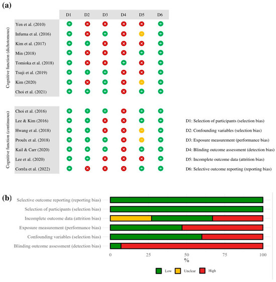 Two researchers judged the risk of bias using the Risk of Bias Assessment tool for Non-randomized Studies (RoBANS) [36], which was cross-checked by the remaining authors. The RoBANS judges the risk of bias of non-randomized studies based on six bias domains: participant selection, confounding variables, exposure measurement, blinding of outcome assessment, incomplete outcome data, and selective outcome reporting. Two authors judged each domain as low risk, high risk, or unclear risk of bias. There is no specific tool for bias assessment in studying the impact of formal social participation on cognition in middle-aged and older adults and, therefore, we adapted the RoBANS tool to suit our research topic (Table S3).