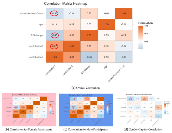 The results of the correlation analysis are presented in Figure 1, where the overall trends are shown in Figure 1a, indicating a positive correlation between the first-round contribution and the second-round contribution (), and a negative correlation with the change in contributions () and a certain negative correlation with the number of correct answers in rule questions ().