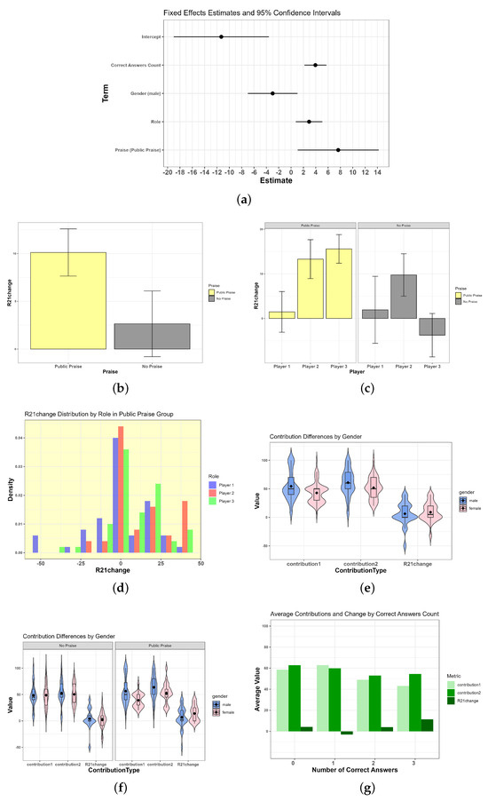 Fixed effects in the multilevel model analysis. (a) Fixed effects estimates and 95% confidence intervals; (b) praise effects on contribution; (c) behavioral difference based on role for being praised players and not being praised players in public-praise condition; (d) the contribution change based on role between Round 1 and Round 2 in public praise condition; (e) gender difference; (f) gender difference in various praise conditions; (g) rule understanding test.