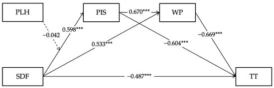 Notes: The model includes the results of the mediation analysis and the moderating effect of the interaction term between supervisor developmental feedback and perceptions of leader hypocrisy in the first stage; standardized coefficients () are displayed. Considering simplicity of the graphic, the path coefficients for the control variables are not presented. SDF = supervisor developmental feedback; TT = time theft; PIS = perceived insider status; WP = work passion; PLH = perceptions of leader hypocrisy; *** .