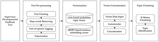 The overall process of identifying topics in supervisor developmental feedback text using the integrated SBERT and LDA framework involved four stages (see Figure 2): first, text preprocessing, including cleaning text data, removing stop-words, and tokenization; second, text vectorization, which employed the LDA topic model to calculate probabilities for the supervisor developmental feedback corpus and used the SBERT model to compute sentence embedding vectors for the feedback text; third, vector concatenation, where the probability vectors generated by the LDA model and the sentence embedding vectors from SBERT were concatenated using an encoder in the latent space to reconstruct the data; and finally, clustering and topic word extraction employing the K-means clustering method and extracting topic words from the clusters of supervisor developmental feedback. This study used Python 3.10 for text topic analysis.