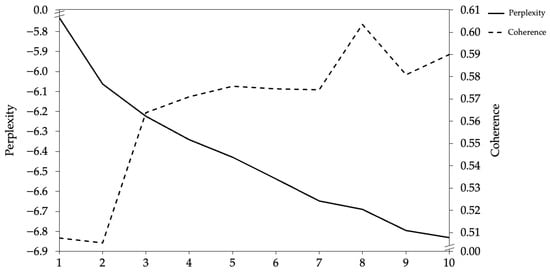 First, this study loaded the language model ‘distilbert-base-nli-mean-tokens’ as the pretrained model for supervisor developmental feedback text, vectorizing 402 pieces of supervisor developmental feedback text data and resulting in a 402 × 768 matrix of vectorized sentence embeddings for supervisor developmental feedback text. Second, to obtain the topic embedding vectors for supervisor developmental feedback text, the study utilized the LDA topic model for computation. To determine the optimal number of topics [], the study considered both topic perplexity and topic coherence as evaluation dimensions (see Figure 3) and explored the topic numbers from 1 to 10. The calculations revealed that when the number of topics was 3, the topic perplexity showed the first inflection point while the topic coherence simultaneously exhibited a peak. Therefore, for this study we selected three topics for the LDA topic model computation. Finally, this study performed autoencoder training and used the t-distributed Stochastic Neighbor Embedding dimension reduction technique, using the sentence vectors formed based on SBERT and the topic vectors generated by the LDA model as input, then mapping them into vectors in a low-dimensional space.