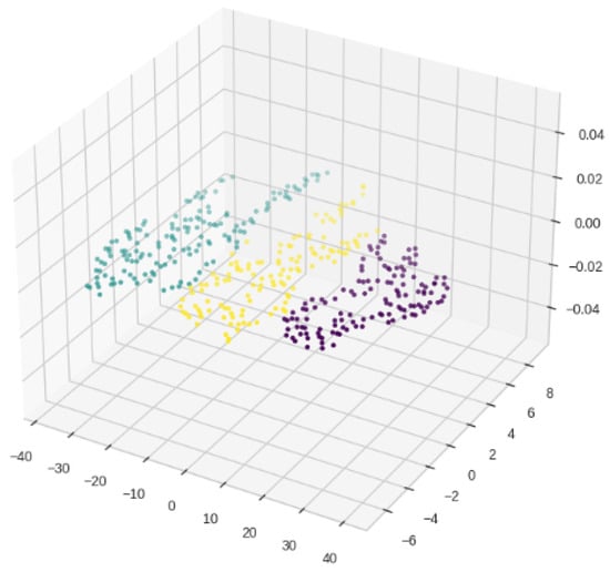 The vectors in the low-dimensional space need further clustering to establish semantic clusters for topic identification. Thus, this study employed the K-means algorithm for topic clustering. This involves partitioning data points into K clusters, where each cluster contains the data points closest to its centroid, thereby maximizing the similarity among data points within the cluster and minimizing the similarity between data points in different clusters. Previous research indicates that the distribution of combined vectors derived from the SBERT+LDA approach is influenced by the number of topics in LDA topic modeling []. Thus, for this study we set K to 3. For the results of the topic clusters distribution in three dimensions, see Figure 4.