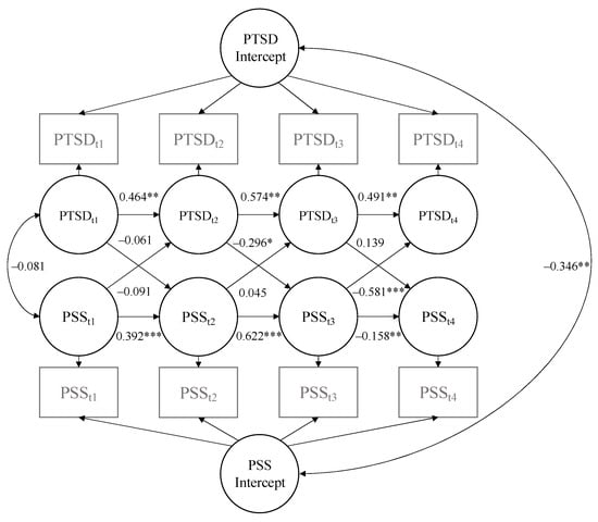 Random intercept cross-lagged panel model illustrating autoregressive and cross-lagged coefficients for PTSD and total social support. PSS = perceived social support; PTSD = post-traumatic stress disorder. * p < 0.05. ** p < 0.01. *** p < 0.001.