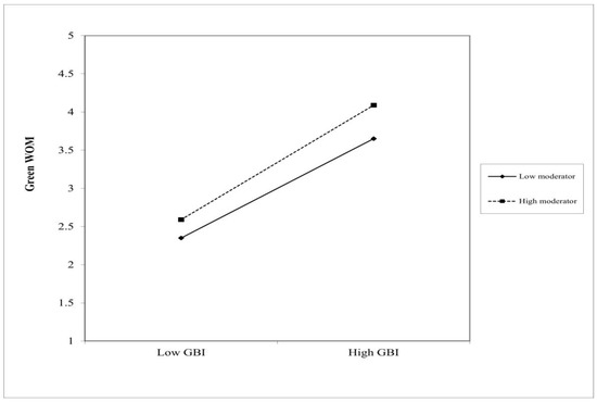 Among the Taipei Fubon Braves fans, green concern had an interaction effect with a green brand image (β = 0.10, standard error [SE] = 0.04, 95% CI = [0.18, 0.02], p < 0.05; Table 5). Thus, green concern moderated the relationship between a green brand image and green WOM (Figure 2). The sample was segmented into high versus low levels of green concern (+1 and −1 standard deviations from the mean, respectively). A green brand image had a significant effect on green WOM in the groups, with both demonstrating high (β = 0.74, SE = 0.07, 95% CI = [0.87, 0.61], p < 0.001) and low (β = 0.56, SE = 0.07, 95% CI = [0.69, 0.43], p < 0.001) levels of green concern (Table 6). Among the non-Taipei Fubon Braves fans, no interactive effect was identified between green concern and the green brand image (β = 0.05, SE = 0.05, 95% CI = [0.16, −0.05], p > 0.05). These results indicate that green concern did not moderate the relationship between the green brand image and green WOM among the non-Taipei Fubon Braves fans. The differential outcomes between the two groups can be interpreted using social identity theory. This theory posits that individuals tend to affiliate with groups that reflect their values and identities, and they maintain their social identity by supporting the behaviors of these groups. Therefore, among Taipei Fubon Braves fans, supporters might be more inclined to support environmentally friendly brands that align with their values and identity. This shared identity can strengthen the influence of the green brand image on green WOM. However, nonfans might lack this sense of identification with the Taipei Fubon Braves team; therefore, they might be less responsive to the relationship between green concerns and the green brand image. These findings, particularly among the Taipei Fubon Braves fans, support H5.