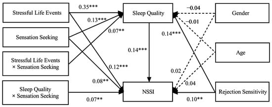 The moderated mediation model. Note: NSSI, non-suicidal self-injury. Gender coded as male = 1, female = 0. The numbers presented on the graph are standardized regression coefficients. Dotted lines represent non-significant pathways. Gender, age, and rejection sensitivity are included as covariates. ** p < 0.01, *** p < 0.001.
