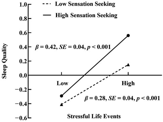 In addition, previous research has suggested that sensation seeking exacerbates the effect of external risk factors on emotional and brain activation. For instance, one study found that, when exposed to external stimuli, individuals with high-level sensation seeking have higher emotional activation and response than those with low levels []. Furthermore, some functional magnetic resonance imaging (fMRI) studies have demonstrated that, compared to individuals with low-level sensation seeking, those with high-level sensation seeking display greater brain and neural activation in response to risk cues [,]. As mentioned above, high physiological activation affects sleep quality []. These collective findings suggest that sensation seeking could potentially moderate the association between external risk factors and sleep quality in adolescents. Interestingly, while previous research has explored the interaction between sensation seeking and external risk factors, particularly in relation to emotional and brain activation, there remains a gap in the literature regarding whether sensation seeking moderates the pathway from stressful life events (as an external risk factor) to sleep quality in adolescents.