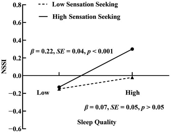 Sensation seeking may also play a moderating role in the relationship between sleep quality and adolescent NSSI. Earlier studies have revealed that the interplay between sensation seeking and sleep quality is associated with an elevated risk of antisocial behavior in the youth []. Moreover, research has provided empirical evidence that high-level sensation seeking can amplify the adverse effects of sleep problems on adolescent risk behaviors []. Specifically, Rusnac et al. [] found that, compared to those with normal sleep patterns, sleep-deprived youth with high-level sensation seeking demonstrated more risky behaviors, whereas sleep-deprived youth with low-level sensation seeking did not show the same tendency. Thus, adolescent sensation seeking may also moderate the pathway from sleep quality to NSSI.