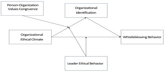 An ethical climate shows the justice of management and demonstrates that an organization values the contribution of its employees and that this can enhance employees’ trust in the organization and willingness to attach to the organizational relationship, thus promoting their organizational identification []. When leaders create an ethical climate in their organization and give it to their employees through empowerment, perceived as supportive of leadership and based on collective contributions, employees feel more connected to their organization and thus organizational identification is created []. Accordingly, when employees share the same perception of the company’s ethical climate, they are likely to have a clear understanding of the ethical behaviors expected from their organization, thus creating organizational identification []. Moreover, employee whistleblowing behavior is based on an effective whistleblowing system; when policies within the organization encourage employees to whistleblow, the ethical climate of the organization is altered and enhanced, which, in turn, leads to whistleblowing behavior that reduces the occurrence of errors in the organization []. In an ethical organizational climate, employees strictly adhere to the organization’s policies and use them to make ethical decisions and solve problems, which, in turn, gives rise to whistleblowing behavior among employees []. As well employees with a high level of organizational identification being more inclined to act in the interests of the organization rather than in their own, whistleblowing behavior can be used to detect problems in the organization in time for early warning []. The more satisfied employees are with their current organization, the more they want to have a voice in the organization and whistleblowing behavior for any violation in the organization satisfies their needs and expectations [].
