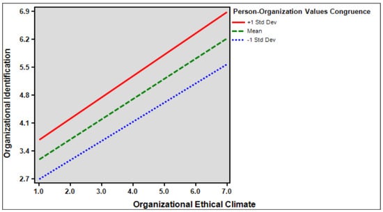 This study emphasizes the moderating role of person–organization value congruence and argues that this variable increases the role of organizational ethical climate in organizational identification. Therefore, the organizational identification of employees in Chinese SMEs is determined by the interaction between the organization’s ethical climate and person–organization value congruence. An employee with a high degree of organizational value congruence will have a higher level of identification with the organization, which will lead to more dedication, satisfaction, and effort toward the organization’s successful cause []. It can be effective in promoting employee engagement in behaviors that are beneficial to the organization at work, thus positively affecting it []. Organizational identification can be seen as a result of value congruence, so when employees are more open and communicative in the workplace, they can better understand the organization and participate in organizational communication, which leads to an increase in value congruence with the organization. When employees’ person–organization value congruence is high, it their trust and commitment to the organization increases, which boosts their organizational identification []. Person–organizational values congruence refers to the congruence between the individual characteristics of the employee and the organization, in which the employee realizes his or her own self-worth in the goals and objectives of the organization, thus showing a positive attitude toward the organization and increasing organizational identification []. Particularly in Chinese SMEs, when the values of employees are aligned with the organization, they have a positive impact on the organization and this positive impact increases employees’ organizational identification. Therefore, when employees’ values are strongly matched with those of the organization, they accept the goals of the organization, are more willing to make efforts toward those goals, and show strong organizational identification, which will contribute to the development of organizational goals []. Therefore, according to these theories, when employees have a high degree of value congruence with their own organization, they feel more deeply that they have become part of the organization’s life, thus increasing overall positive feelings toward the organization and contributing to an increase in organizational identification.