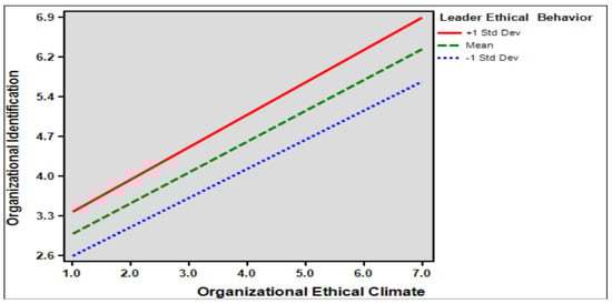 Hypothesis 4 established that leader ethical behavior moderated the effect of organizational ethical climate on organizational identification. The findings indicate that leader ethical behavior significantly moderated the effect of organizational ethical climate on organizational identification (β = 0.054, p < 0.05). This means that the higher the leader ethical behavior, the greater the impact of organizational ethical climate on organizational identification. Therefore, hypothesis 4 is supported and through the results, we can find that the interaction between leader ethical behavior and the organizational ethical climate will lead to a higher degree of organizational identification. Table 8 presented below is pragh moderating effect of leader ethical behavior on the relationship between organizational ethical climate and organizational identification.