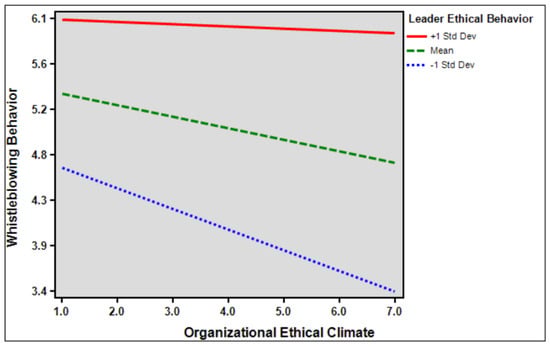 This study also emphasizes the moderating role of leaders’ ethical behavior and suggests that it can increase the role of the organization’s ethical climate in organizational identification and whistleblowing behavior. Therefore, the organizational identification and whistleblowing behavior of employees in Chinese SMEs are determined by the interaction between the organization’s ethical climate and leaders’ ethical behavior. Leaders with highly ethical behavior value and reward norms and policies of ethical behavior and ensure that organizational outcomes are influenced by an ethical work environment []. In addition, the leadership role affects both employees and the organization; therefore, when leaders set themselves as role models in the organization, they encourage and motivate employees to engage in certain ethical behaviors []. Therefore, ethical leadership behaviors lead to the convergence of employees’ self-identification and organizational identification, which, in turn, has a positive impact on employees’ organizational identification []. Positive and reliable leaders may play a key role in promoting whistleblowing behavior []. Leader ethical behavior is used as a benchmark to help shape employee behavior, encourage ethical decision making, and promote whistleblowing behavior by reducing the threat posed by retaliation []. Therefore, when ethical leadership behavior is strong, employees’ organizational identification and whistleblowing behaviors also increase. This suggests that ethical leadership behavior has a positive impact on Chinese SMEs. Under this influence, organizational identification and whistleblowing behavior among employees increases. Therefore, when the standard of ethical leadership behavior is high in Chinese SMEs, employees use the leader as a role model and increase their own concern for organizational ethics. This increases organizational identification and whistleblowing behavior.