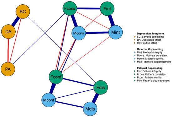 Independent sample t-tests were conducted to explore gender differences between paternal and maternal coparenting. Furthermore, network analysis was performed with RStudio (version 4.2.2). Firstly, network structures were constructed using the R-package qgraph [67,94]. The edges linking two nodes represented the regularized partial correlation coefficients between the parental coparenting network and young adolescents’ depression symptom network. Secondly, the strength and bridge strength of each node were calculated to clarify the significance of the nodes in the network. Higher values of the strength represent greater significance of nodes in the network, and higher bridge strength values for nodes indicate better capability to amplify activation of other network symptoms [78]. In the current network structure, the 11 nodes were categorized into two subnetworks, namely, the parental coparenting subnetwork and the depression symptom subnetwork. Finally, the robustness of the network was examined, including the accuracy of edge weights as well as the stability of strength and bridge strength of each node. To achieve this, the bootnet package in R was applied, which could examine the invariance of centrality indices by employing a bootstrap method to reduce the sample size in the network structure [95]. Furthermore, correlation stability coefficients (CS coefficients) were utilized to assess the stability of centrality indices, where a CS coefficient of 0.70 indicated the maximum acceptable reduction in sample size. CS coefficients above 0.50 were considered acceptable, with a minimum requirement of 0.25 [67,95].