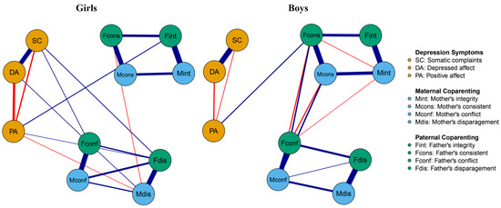 Although the present study provided a comprehensive and nuanced understanding of how parental coparenting is linked to depression in young Chinese girls and boys, there are several limitations that need to be considered when interpreting our results. Firstly, as this study was a cross-sectional survey, we are unable to definitively establish whether positive and negative parental coparenting behaviors contribute to an increased risk of depression in youth or whether the presence of depression in youth alters the coparenting pattern. A longitudinal study that tracks parental coparenting both before and after the onset of youth depression, employing the cross-lagged panel network analysis method, would be beneficial in determining whether changes in coparenting precede the emergence of depression or occur subsequent to it. Such research would shed light on the causal mechanisms underlying the relationship between coparenting and youth depression. Secondly, parental coparenting and youth depression were assessed through adolescents’ self-reports. Although adolescent-reported parenting is commonly used [120], this method could be susceptible to social desirability bias and the subjective judgment of adolescents. In view of this, future research might employ multiformat (such as reported from a parental perspective) and multimethod (such as on-site observations or video scoring) assessment methods to more comprehensively measure parental coparenting and adolescents’ depression. Thirdly, participants in this study were exclusively drawn from a province in Northern China, raising concerns about the generalizability of results to diverse cultures and populations. Thus, cross-cultural and cross-group research is required to further examine the results of this study. Fourthly, the relationship between parental coparenting behavior and children’s depression could be mediated or moderated by other family factors (e.g., parental depression and anxiety, parental self-efficacy) [121,122], but the current study is primarily focused on the impact of parental coparenting behaviors on youth depression. Future studies could consider collecting data on these additional factors and utilize network analysis to test their potential mediating or moderating effects on the relationship between coparenting and adolescent depression. Fifthly, it is imperative to acknowledge that a child’s depression can be influenced by a multitude of interconnected systems. Drawing upon the family–peer system linkages theory [82,123], the school system (e.g., teacher–adolescent relationships) and the peer system (e.g., characteristics of friends) may interact with family dynamics, collectively affecting adolescent mental health. Moreover, biological factors, such as genetic susceptibility, neural development and hormonal fluctuations during puberty, may also contribute to the etiology of adolescent depression [124]. Consequently, future research ought to endeavor to examine the complex interplay between these diverse systems and biological elements in shaping adolescent mental health outcomes. Ultimately, while the present study identifies children’s perceptions of parental coparenting behavior as a potential therapeutic target for addressing adolescent depression, it is essential to recognize the necessity for further intervention research to rigorously validate and elaborate on our findings. Moreover, longitudinal investigations are warranted to ascertain the sustained impacts of interventions that incorporate coparenting dynamics, thereby enhancing the empirical foundation for evidence-based clinical practices in this domain.