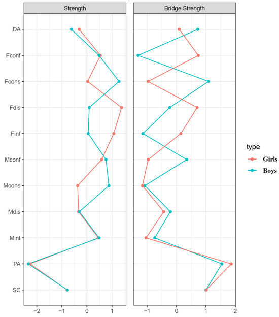 As depicted in Figure 4, in the girls’ network, the nodes with a strength value greater than 1 were Fdis (father’s disparagement, strength = 1.38) and Fint (father’s integrity, strength = 1.07), whereas in the boys’ network, the node with a strength value greater than 1 was Fcons (father’s consistency, strength = 1.28). In both networks, nodes with bridge strength values greater than 1 were PA (positive affect) and SC (somatic complaints). Notably, in the boys’ network, Fcons (father’s consistency) also demonstrated a higher bridge strength, indicating that these nodes served as significant bridges linking the entire network.