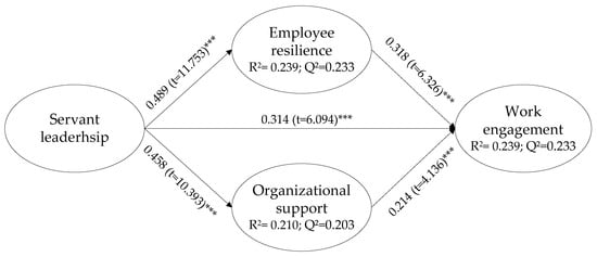 As H3 and H5 are supported, the survey formulates a mediated hypothesis that reveals the mediating effect of organizational support between servant leadership and work engagement. As Figure 1 shows, the direct effect of servant leadership on work engagement is significant (β = 0.314, t = 6.094, p < 0.001), while the indirect effect through organizational support is also significant (β = 0.098, t = 3.934, p < 0.001). Thus, organizational support plays an indirect mediation role between servant leadership and work engagement.