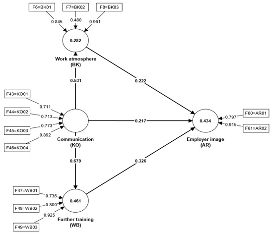 The PLS analysis performs the estimation in a three-stage procedure and designates the structural model as the inner model and the measurement model of the latent constructs as the outer model. The inner model specifies the relationship between the latent constructs, while the outer model measures the relationship between latent constructs and the correspondingly assigned manifest, directly observable indicator variables [81]. The “inner estimation” determines the weights and construct values of the structural model. The subsequent “outer estimation” determines the weights and construct values of the measurement model. In the case of a formative measurement model, multiple regression coefficients are used to reflect the influence of the indicators on the latent variable [74,86]. As the statistical values of the coefficients of determination (R2) show, the R2 values are moderate for the AR and WB constructs and weak for the BK construct. Accordingly, the fit of the regression function can only be considered partially good.
