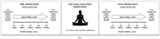In the audio–tactile task, participants were blindfolded and seated beside a table on which the audio–tactile apparatus was mounted on, in a soundproof room. Two loudspeakers were in the room: the first one was positioned next to the participants’ left cheek (“near loudspeaker”) at an elevation of 100 cm and 5 cm distant from the participants’ left cheek; the second was far from the participants (“far loudspeaker”), with the same elevation and 100 cm distant from the near loudspeaker. Auditory stimuli from the loudspeakers were samples of pink noise (44.1 kHz), lasting 3000 ms, whose intensity was manipulated for having an approaching dynamic sound (IN sound) with exponentially rising acoustic intensity from 55 to 70 dB of Sound Pressure Level (SPL). For the IN sound, the far loudspeaker started at the maximum intensity, and its intensity decreased along the trial, with the near loudspeaker intensity gradually rising so that it gave the impression of a sound source moving from the far to the near loudspeaker. Tactile stimuli were administered on the participants’ left cheek, delivered using a constant-current electrical stimulator (DS7A, Digitimer, Hertfordshire, United Kingdom) via a neurological tip electrode. The electrical stimulus was a single, constant voltage, rectangular monophasic pulse (duration = 100 μs), whose intensity was set before the experiment, in a separate calibration session, individually for each subject to be clearly above thresholds. During the meditation session, participants were guided in a 15-min mindfulness meditation by a prerecorded male voice, which they could hear using two loudspeakers while being blindfolded and comfortably seated beside a table. The task was developed and delivered via E-prime 2.0 software.
