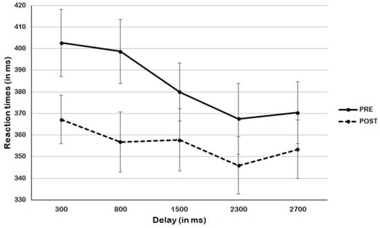 Reaction times for each delay in pre- and post-meditation sessions. All measures are reported as mean ± SEM.