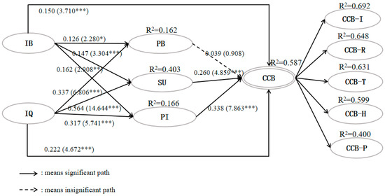 The hypothesized causal relationships were then tested using the bootstrapping method (bootstrapping = 5000). Figure 2 and Table 5 illustrate that both resident–tourist interaction behavior and quality significantly influenced community citizenship behavior at the p < 0.001 level, supporting H1a and H1b. Furthermore, interaction behavior had a significant effect on personal benefits, sympathetic understanding, and place identity at varying levels of significance: βH2a: RB→PB = 0.126 (p < 0.05); βH5a: RB→SU = 0.147 (p < 0.001); βH8a: RB→PI = 0.162 (p < 0.01), suggesting that H2a, H5a, and H8a were supported. Similarly, at the level of p < 0.001, the causal relationships between interaction quality and personal benefits (βH2b: IQ→PB = 0.337), sympathetic understanding (βH5b: IQ→SU = 0.564), and place identity (βH8b: IQ→PI = 0.317) were confirmed, supporting H2b, H5b, and H8b. In the path leading to CCB, the significant roles of sympathetic understanding (βH6: SU→CCB= 0.260, t = 4.859***) and place identity (βH9: PI→CCB= 0.338, t = 7.863***) were confirmed. Surprisingly, personal benefits did not prove to be a predictor of CCB (βH3: PB→CCB = 0.039, p < 0.05). Therefore, H6 and H9 were statistically supported, while H3 was rejected.