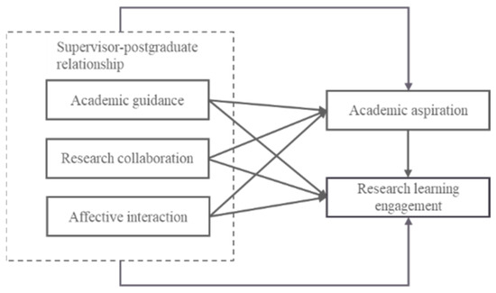 It has been shown that there is a mutually reinforcing relationship between academic ambition, as a support for postgraduate students to invest a certain amount of time and energy in research, and learning engagement [35]. Some scholars have confirmed and further pointed out that postgraduate students’ interest in research can motivate them to increase their participation in research activities [36], and research engagement can also have a significant positive impact on their academic aspiration [37]. Additionally, it was demonstrated by Mageau et al. that passion is linked to higher levels of participation in activities [38]. Therefore, this study suggests that academic aspiration may have an impact on postgraduate students’ research learning engagement. Based on Cohen’s social support theory, it is known that social support can have a generally gainful effect on individuals, and good social support can bring positive emotional experiences to individuals [39]. Ruiz-Alfonso et al. also argued that supportive environments and positive relationships are the most important influences for individuals to develop and maintain passion [40]. Within the field of postgraduate education, supervisors’ support is one of the important social supports that master’s students can perceive, which may play a key role in stimulating their academic aspirations and motivating their research motivation. It has been shown that the supervisor–postgraduate relationship is an important factor affecting the academic aspirations of postgraduate students, and a positive supervisor–postgraduate relationship is conducive to enhancing postgraduate students’ academic aspirations [32]. In particular, affective interaction between supervisors and master’s students positively predicted academic commitment, and the higher the academic interactions between supervisors and master’s students, the higher the academic aspirations of master’s students [41]. On the other hand, the study by Li et al. demonstrated that postgraduate students’ academic enthusiasm would likely increase with the intensity of the supervisor in terms of academic guidance and life care, and that there would also likely be a significant increase in the amount of time for independent study and scientific research activities [42]. In addition, other studies have confirmed that academic aspiration is an intrinsic motivation for postgraduate students to engage in research activities, and that mentoring can promote the growth of postgraduate students’ research ability by stimulating their academic aspiration [43]. This may imply that master’s students with a more satisfactory perception of the supervisor–postgraduate relationship have higher academic aspirations, which in turn results in increased engagement in research learning, and finally, improvements in their research ability. On this basis, the following hypotheses were put forward for this study: