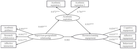 The structural equation was used to test the mediating effect of academic aspiration between the supervisor–postgraduate relationship and master’s students’ research learning engagement. Because of the large number of measurement items included in the three scales and the small sample size of this study, modeling directly using the original questions is prone to random error [49]. Therefore, as recommended by Wu et al. (2011) [49], the three scales were first packaged using the factorial method before being included in the structural equation analysis in order to avoid random errors. Specifically, the internal consistency method was used to package the two multidimensional scales of the supervisor–postgraduate relationship and research learning engagement into three indicators each, and the high and high loadings method of the factorial method was used to package the unidimensional scale of academic aspirations into two indicators.