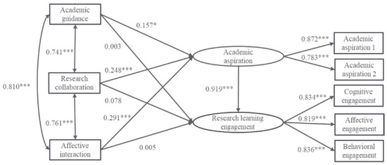 Model of the mediating effect of academic aspiration between the dimensions of supervisor–postgraduate relationship and research learning engagement (M2). Note: * p < 0.05, *** p < 0.001.