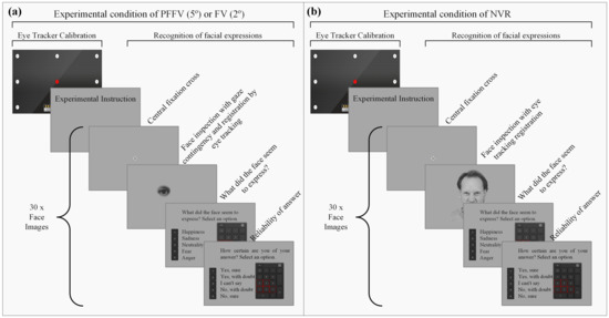 Experimental design of collection procedure according to experimental condition. The screen order is presented from top to bottom. The group of screens presenting the random facial stimulus and its judgment is repeated 30 times. (a) Experimental groups PFFV and FV differ only in the aperture size for the moving window controlled by the participants’ gaze detected by the eye tracker. (b) Experimental group NVR presents the full image. The facial image in the example was obtained from the KDEF image database (ID: AM10ANS).
