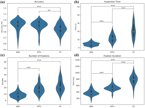 Summary analysis by experimental condition. Violin plots for (a) accuracy, (b) visual inspection time, (c) number of fixations, (d) fixation duration. Note: **, and *** denote statistical significance at the , and levels, respectively.